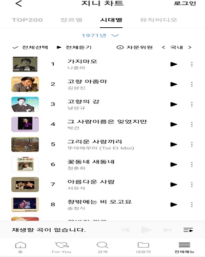 음악 플랫폼인 지니에 들어가면 상단 좌측 메뉴바에서 지니차트 시대별 차트에서 날짜 선택을 통해 1970년대의 국내/국외 팝송을 찾아볼 수 있습니다. ‘가지마오’ 라는 곡은 71년에 1위를 한 곡인데요. 트로트 같은 느낌이 돋보이는 유명 가수 나훈아의 곡입니다. 그 외에도 조용필의 ‘돌아와요 부산항에’ 라는 곡인 77년도 1위 곡인데요. 특유의 당시 리듬과 멜로디와 함께 조용필의 목소리가 어울리는 곡입니다.